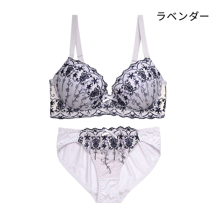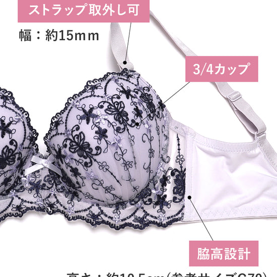 上品な刺繍と脇高設計で、エレガントで安定感のあるバストラインを叶えるブラ&ショーツ