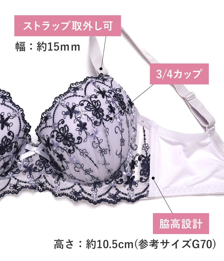 - 3/4カップ – バストをしっかり包み込みながら、自然な丸みと美しい谷間をメイクします。