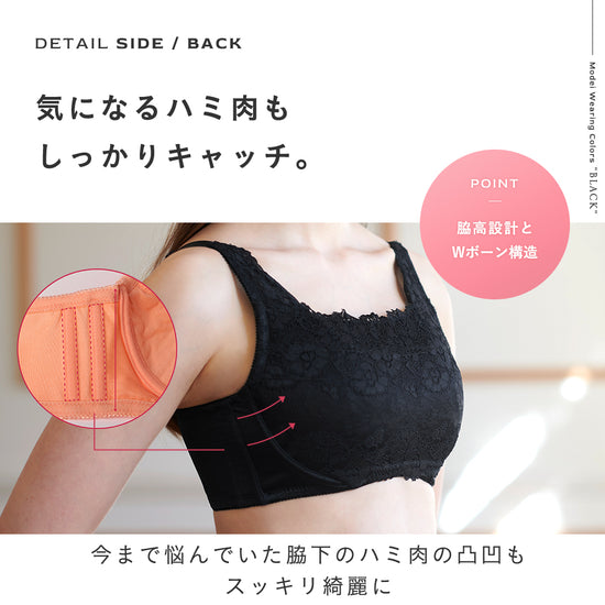谷間をきれいに見せながら、バストの横流れを防ぐ機能性ブラジャー