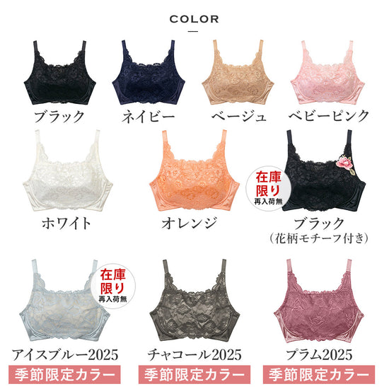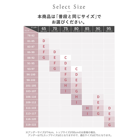 | 仕様 | ホック:3段3列 パッドなし(パッドポケットなし) ストラップ:取外し不可 ストラップ幅:CDカップ/E65-80/F65-75/G65-70約15mm・E85/F80-85/G75-85/HIカップ約18mm ワイヤー:入り |