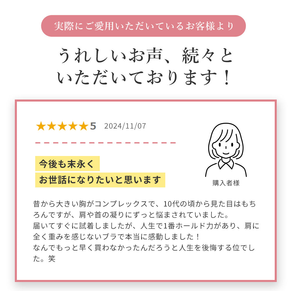 | 仕様 | ホック:3段3列 パッド:パッドなし(パッドポケットなし) ストラップ:取外し不可 ストラップ幅:CDカップ/E65-80/F65-75/G65-70約15mm・E85/F80-85/G75-85/HIカップ約18mm ワイヤー:入り |