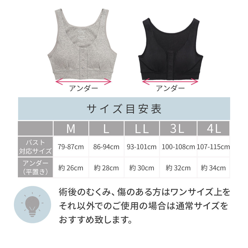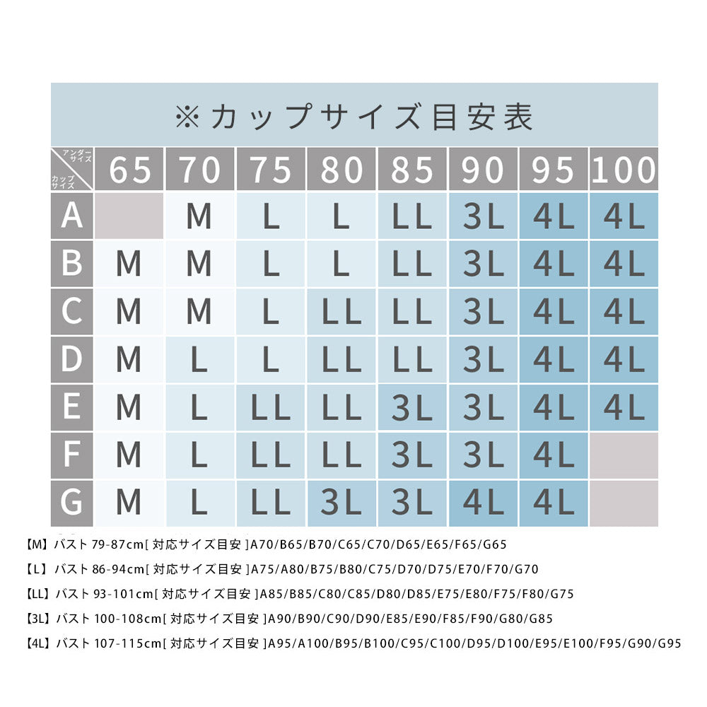 | サイズ | 【M】バスト79-87cm 【L】バスト86-94cm 【LL】バスト93-101cm 【3L】バスト100-108cm 【4L】バスト107-115cm [平置きサイズ] アンダー(ボタンをはめた状態で):【M】約26cm・【L】約28cm・【LL】約30cm・【3L】約32cm・【4L】約34cm |