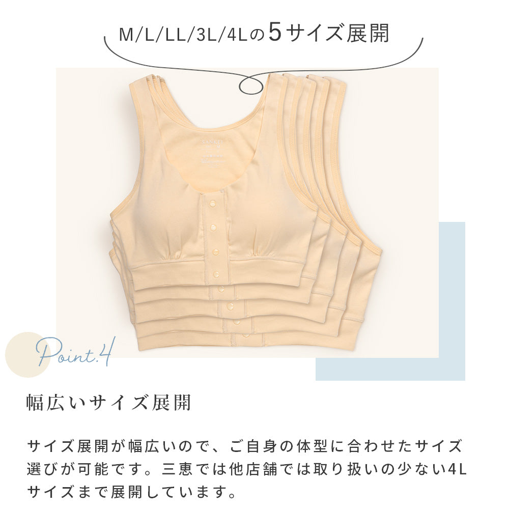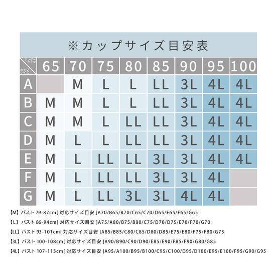 | サイズ | 【M】バスト79-87cm 【L】バスト86-94cm 【LL】バスト93-101cm 【3L】バスト100-108cm 【4L】バスト107-115cm [平置きサイズ] アンダー(ボタンをはめた状態で):【M】約26cm・【L】約28cm・【LL】約30cm・【3L】約32cm・【4L】約34cm |