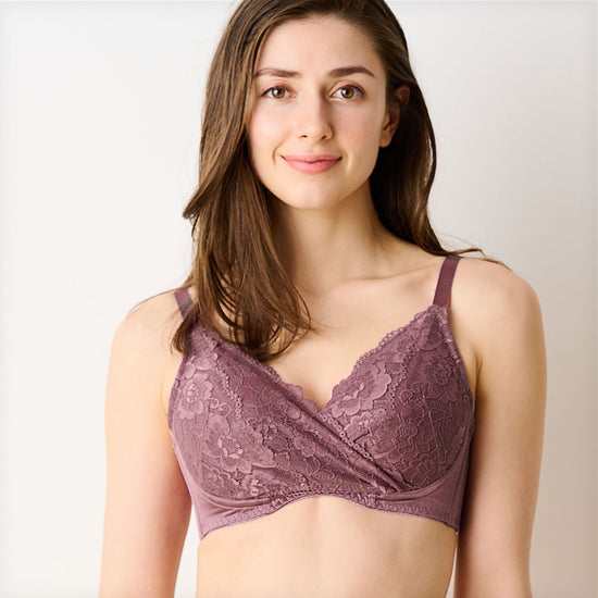 バストを自然にコンパクトに見せつつ、女性らしいシルエットを演出。Vネックやカシュクールデザインの服にも馴染むエレガントなブラ。