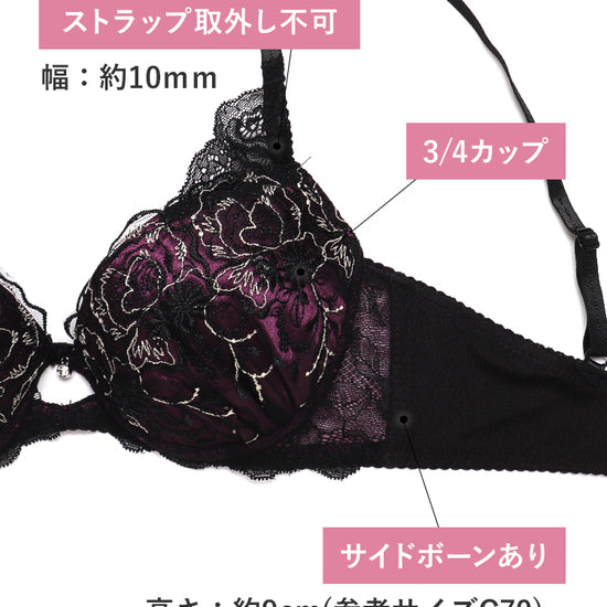 - フィット感抜群の3/4カップ – バストをしっかり包み込みながら、自然な丸みと美しい谷間をメイクします。