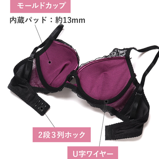 仕様 | [ブラ] カップ:3/4カップ ホック:2段3列 パッド:厚内蔵パッド(約13mm)・パッドなし(ポケットなし) ストラップ:取り外し不可・幅約10mm ワイヤー:ミディアムワイヤー入り(U字) サイドボーン:あり 脇の高さ:約9cm [フルバックショーツ] 透け感:なし クロッチ当て布:あり 伸縮性:タテ○ ヨコ○(バックのみ) |