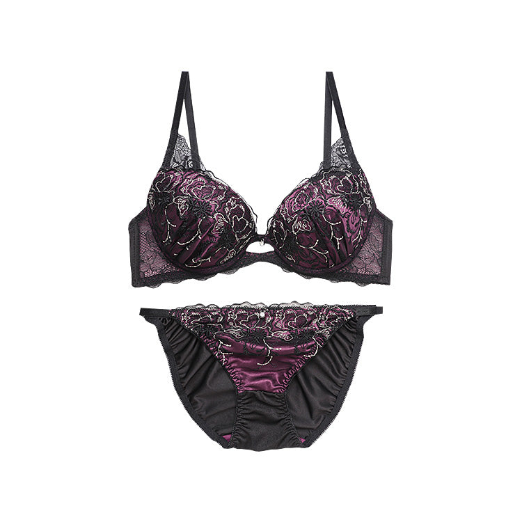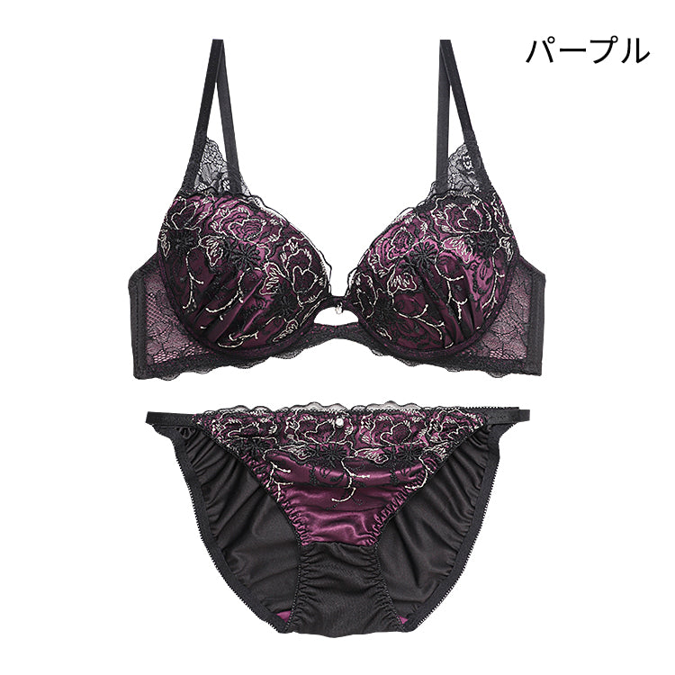 艶やかな光沢とレースの透け感が、大人の色気を演出するブラ&ショーツセット