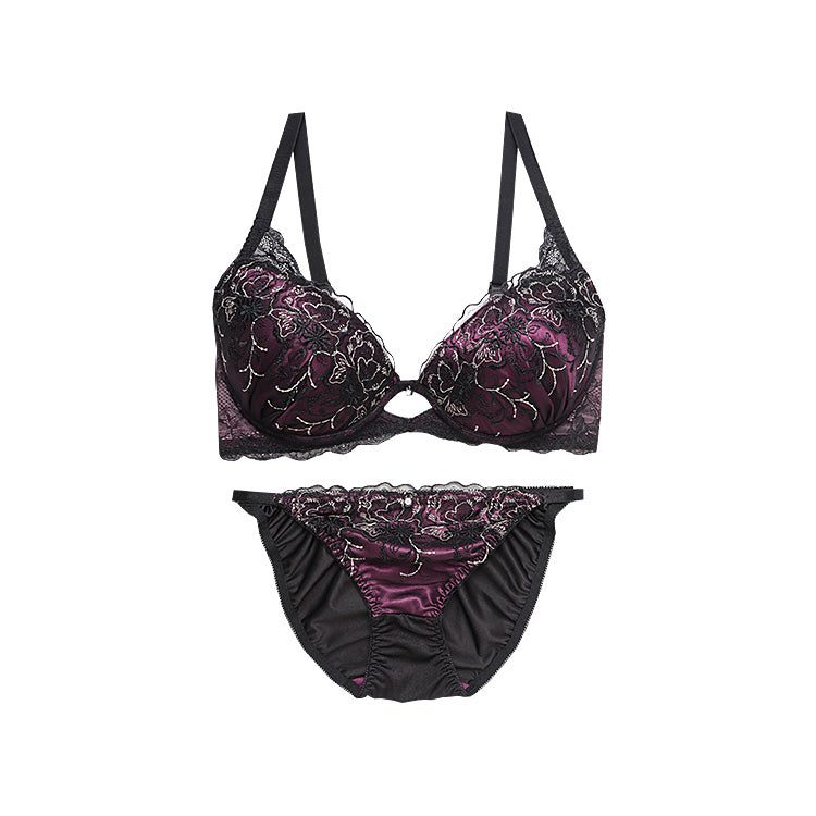 艶やかな光沢とレースの透け感が、大人の色気を演出するブラ&ショーツセット
