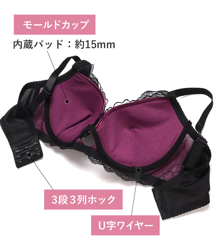 仕様 | [ブラ] カップ:3/4カップ ホック:3段3列 パッド:厚内蔵パッド(約15mm)・パッドなし(ポケットなし) ストラップ:取り外し不可・幅約15mm ワイヤー:ミディアムワイヤー入り(U字) サイドボーン:あり 脇の高さ:約10.5cm [フルバックショーツ] 透け感:なし クロッチ当て布:あり 伸縮性:タテ○ ヨコ○(バックのみ) |
