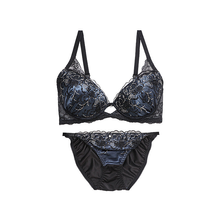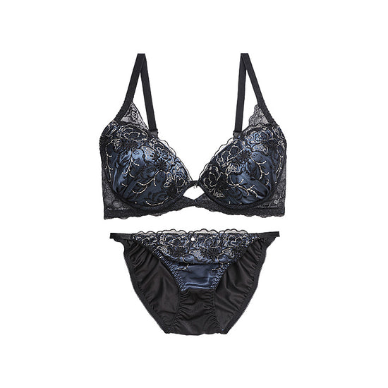 艶やかな光沢とレースの透け感が、大人の色気を演出するブラ&ショーツセット