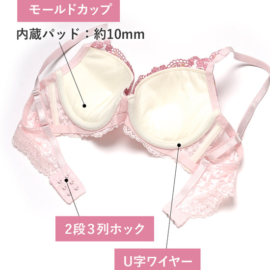 仕様 | [ブラ] カップ:3/4カップ ホック:2段3列 パッド:厚内蔵パッド(約10mm)・パッドなし(ポケットなし) ストラップ:取り外し不可・幅約10mm ワイヤー:ミディアムワイヤー入り(U字) サイドボーン:あり 脇の高さ:約9cm [フルバックショーツ] 透け感:ややあり クロッチ当て布:あり 伸縮性:タテ○ ヨコ○(バックのみ) |