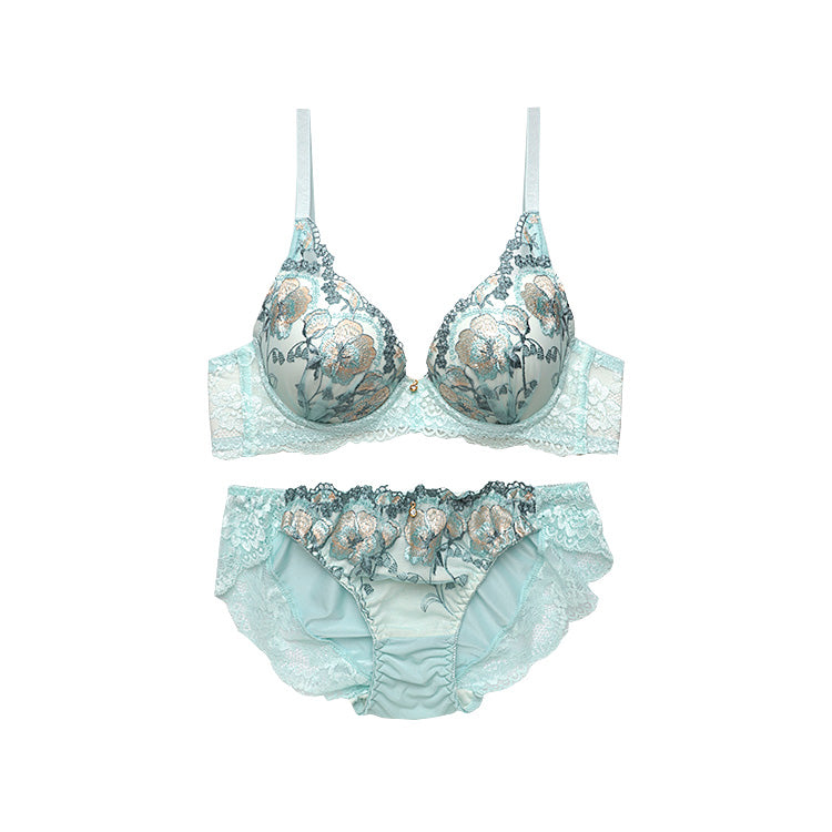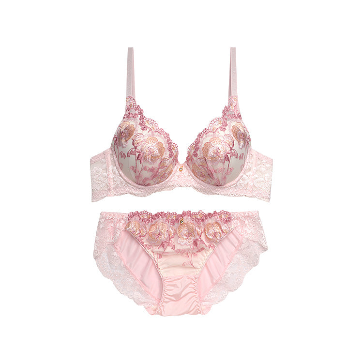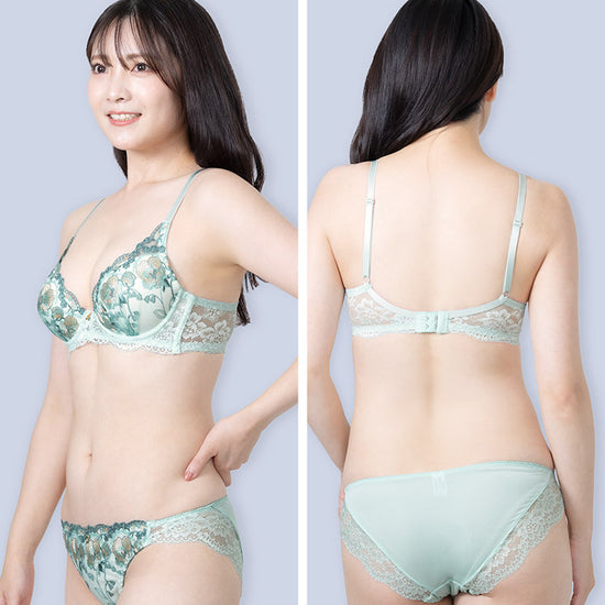 柔らかな色合いと繊細な刺繍で、フェミニンで美しいバストラインを演出するブラ&ショーツ