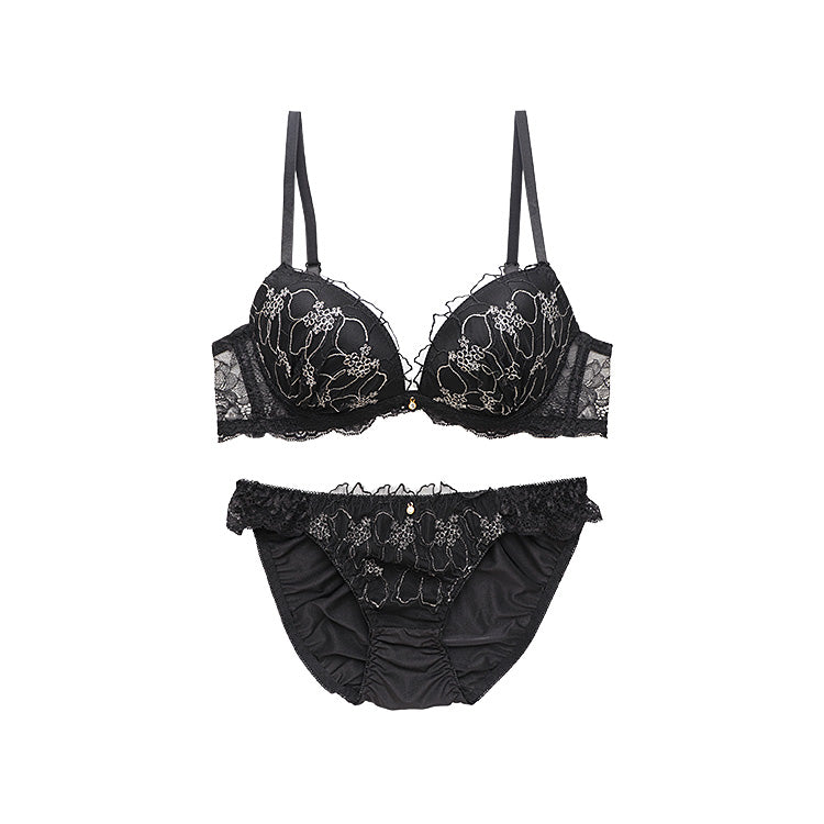 シックなカラーに華やかなラメ刺繍を添えた、脇高機能付きのブラ&ショーツ