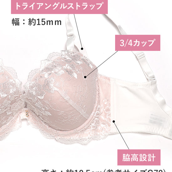 - 3/4カップ – バストをしっかり包み込みながら、自然な丸みと美しい谷間をメイクします。