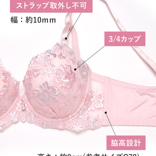 | 仕様 | [ブラ] カップ:3/4カップ ホック:2段3列 パッド:厚内蔵パッド(約12mm)・パッドなし(ポケットなし) ストラップ:トライアングルストラップ(取り外し不可)・幅約10mm ワイヤー:ミディアムワイヤー入り(U字) サイドボーン:あり 脇の高さ:約9cm [フルバックショーツ] 透け感:ややあり クロッチ当て布:あり 伸縮性:タテ○ ヨコ○(バックのみ)  |