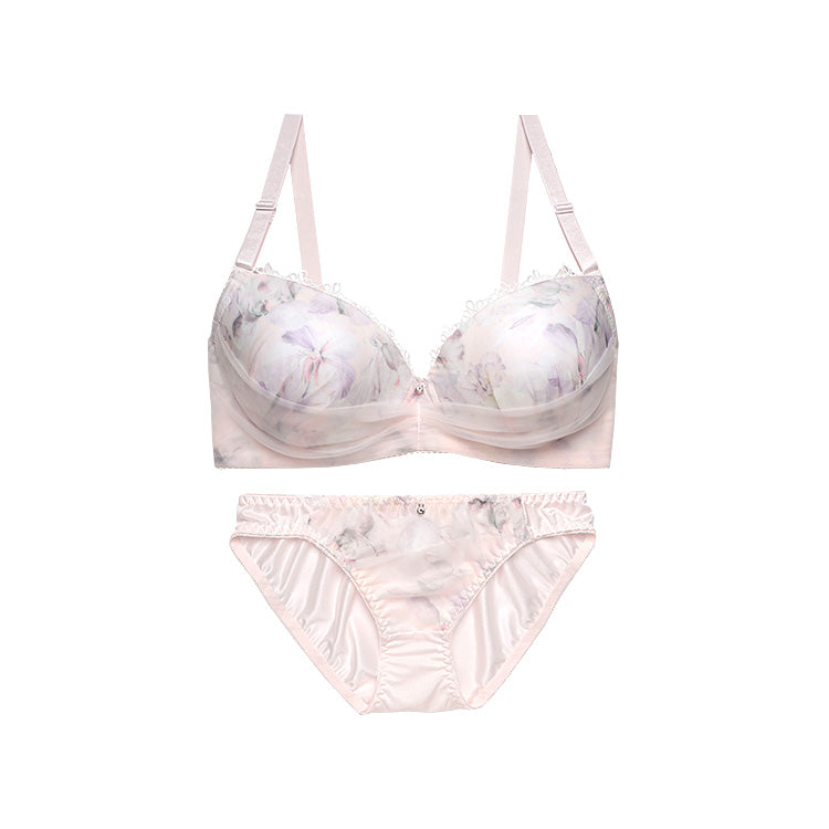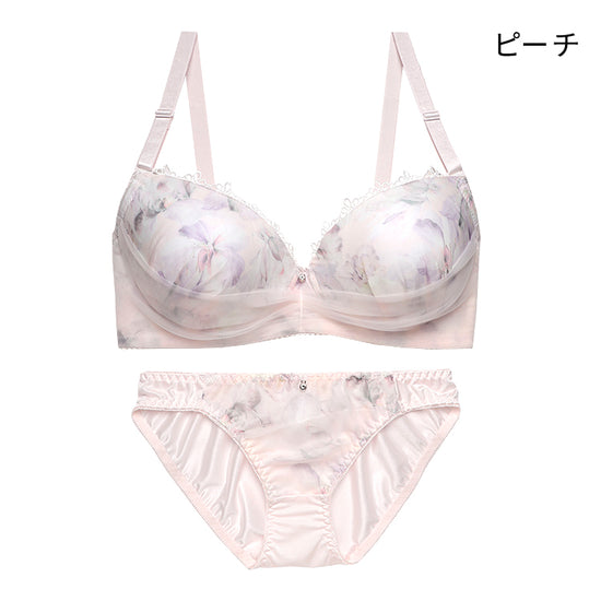 水彩画のような繊細な花柄が魅力の、フェミニンなブラ&ショーツセット