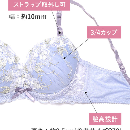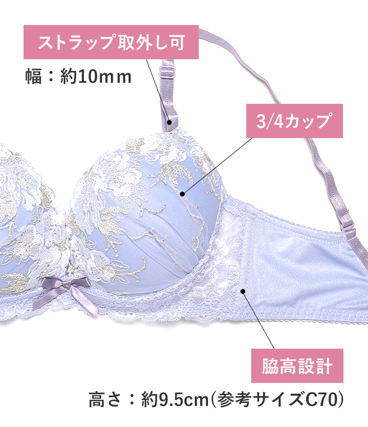 | 仕様 | [ブラ] カップ:3/4カップ ホック:2段3列 パッド:厚内蔵パッド(約13mm)・レモンパッドなし(ポケットなし) ストラップ:取外し可・幅約10mm ワイヤー:ミディアムワイヤー(L字) サイドボーン:あり 脇の高さ:約9.5cm(参考サイズC70) [フルバックショーツ] 透け感:ややあり クロッチ当て布:あり 伸縮性:タテ○ ヨコ○ ※ショーツサイズの交換は出来ません。 |