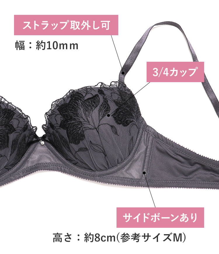 - 3/4カップ – バストを下から持ち上げ、自然な丸みと美しい谷間を形成します。