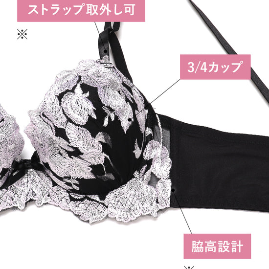 透け感のある花柄レースと脇高設計で、上品で美しいバストラインを演出するブラ&ショーツ