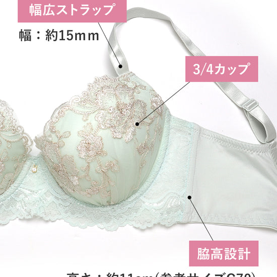 - フィット感抜群の3/4カップ – バストをしっかり包み込みながら、自然な丸みと美しい谷間をメイクします。