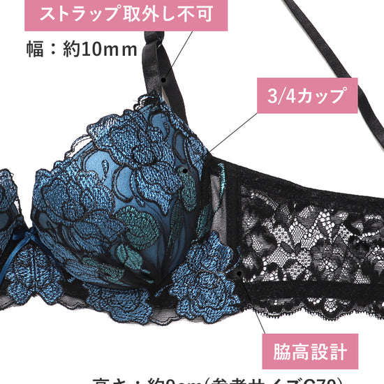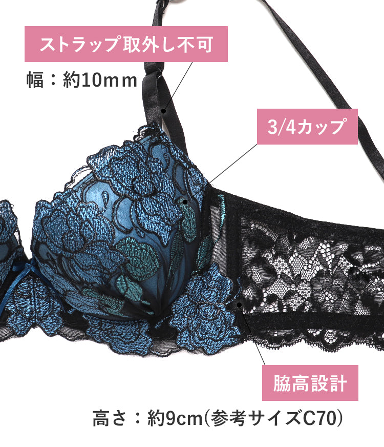 - フィット感抜群の3/4カップ – バストをしっかり包み込みながら、自然な丸みと美しい谷間をメイクします。
