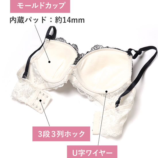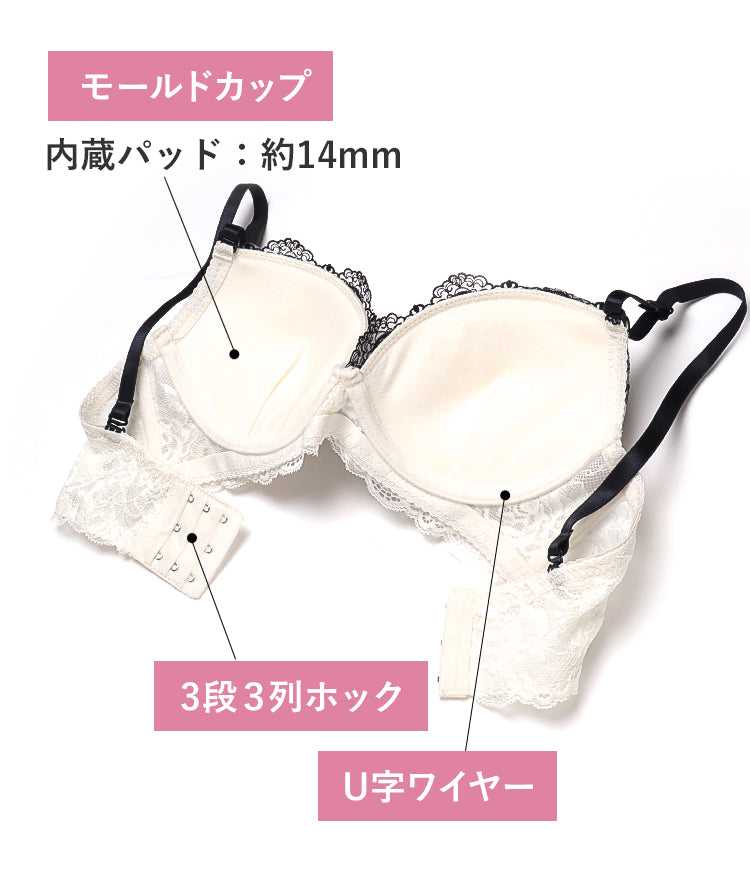 | 仕様 | [ブラ] カップ:3/4カップ ホック:3段3列 パッド:厚内蔵パッド(約14mm)・パッドなし(ポケットなし) ストラップ:取り外し可・幅約10mm ワイヤー:ミディアムワイヤー入り(U字) サイドボーン:あり 脇の高さ:約9.5cm [フルバックショーツ] 透け感:あり(バックレース) クロッチ当て布:あり 伸縮性:タテ○ ヨコ○(バックのみ) |