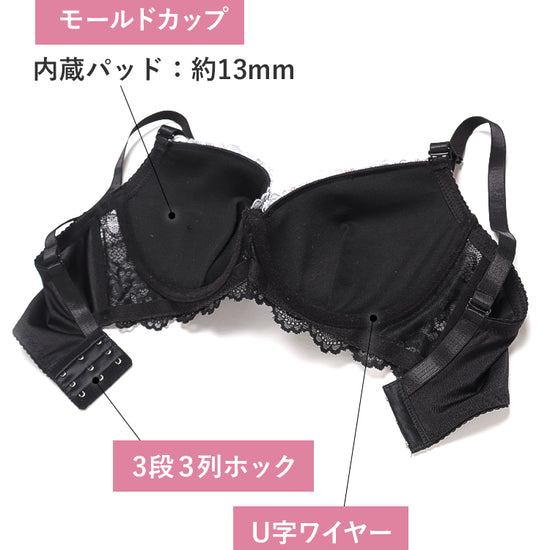 | 仕様 | [ブラ] カップ:3/4カップ ホック:3段3列 パッド:厚内蔵パッド(約14mm)・パッドなし(ポケットなし) ストラップ:取り外し可・幅約15mm ワイヤー:ミディアムワイヤー入り(U字) サイドボーン:あり 脇の高さ:約10.5cm [フルバックショーツ] 透け感:ブラックなし/ホワイトややあり クロッチ当て布:あり 伸縮性:タテ○ ヨコ○(バックのみ) |