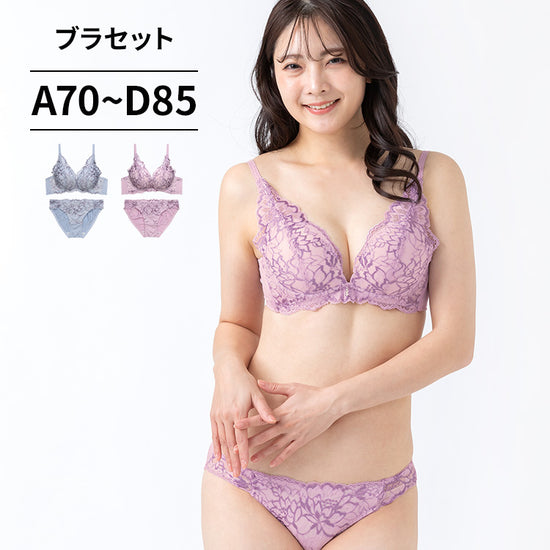 繊細な大柄レースと厚めパッドで、華やかな谷間をメイクするブラ&ショーツ