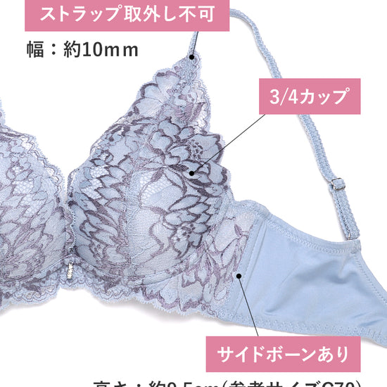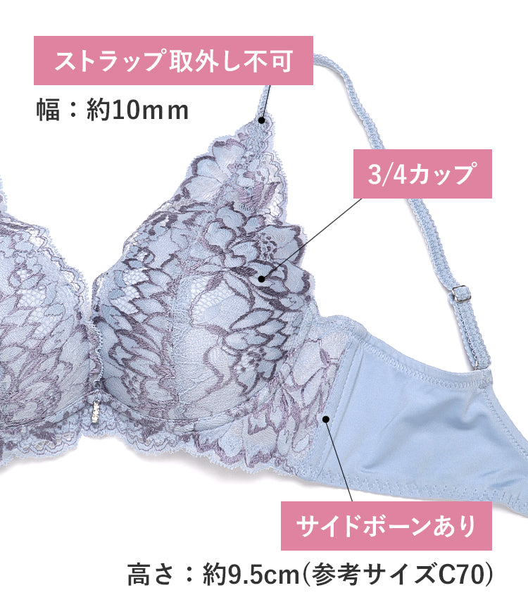 | 仕様 | [ブラ] カップ:3/4カップ ホック:2段3列 パッド:厚内蔵パッド(約18mm)・パッドなし(ポケットなし) ストラップ:取り外し不可・幅約10mm ワイヤー:ミディアムワイヤー入り(L字) サイドボーン:あり 脇の高さ:約9.5cm [フルバックショーツ] 透け感:なし クロッチ当て布:あり 伸縮性:タテ○ ヨコ○(バックのみ) |