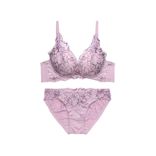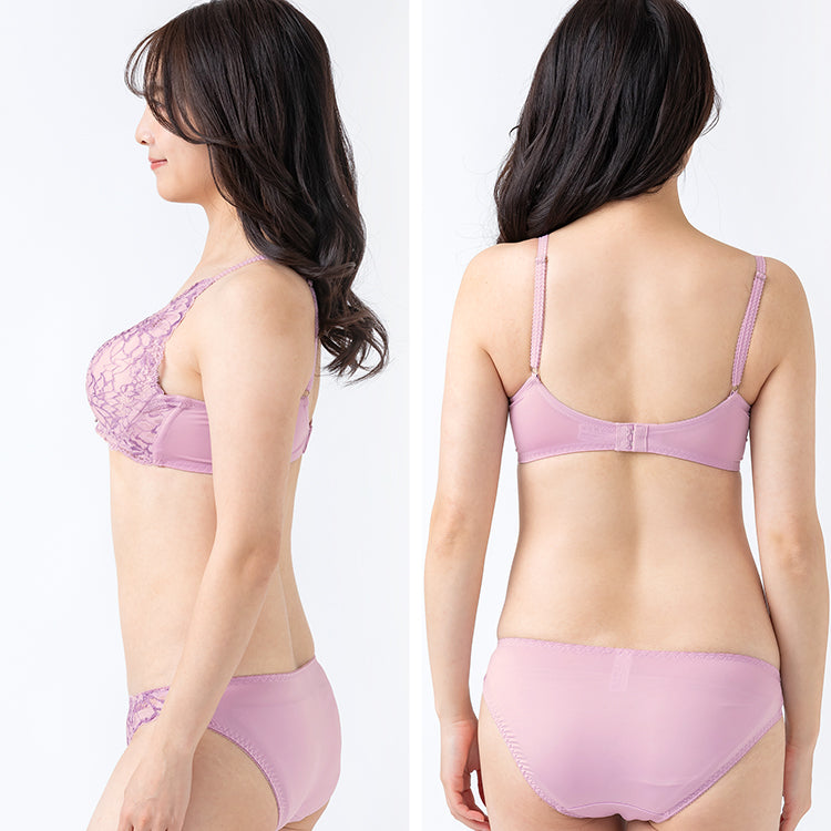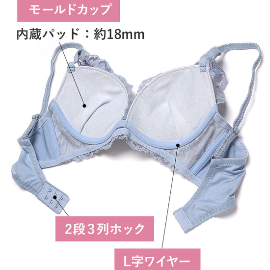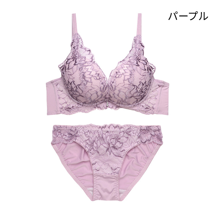 繊細な大柄レースと厚めパッドで、華やかな谷間をメイクするブラ&ショーツ