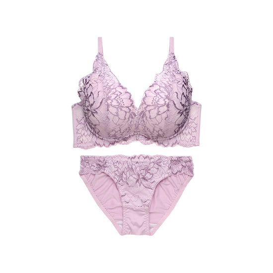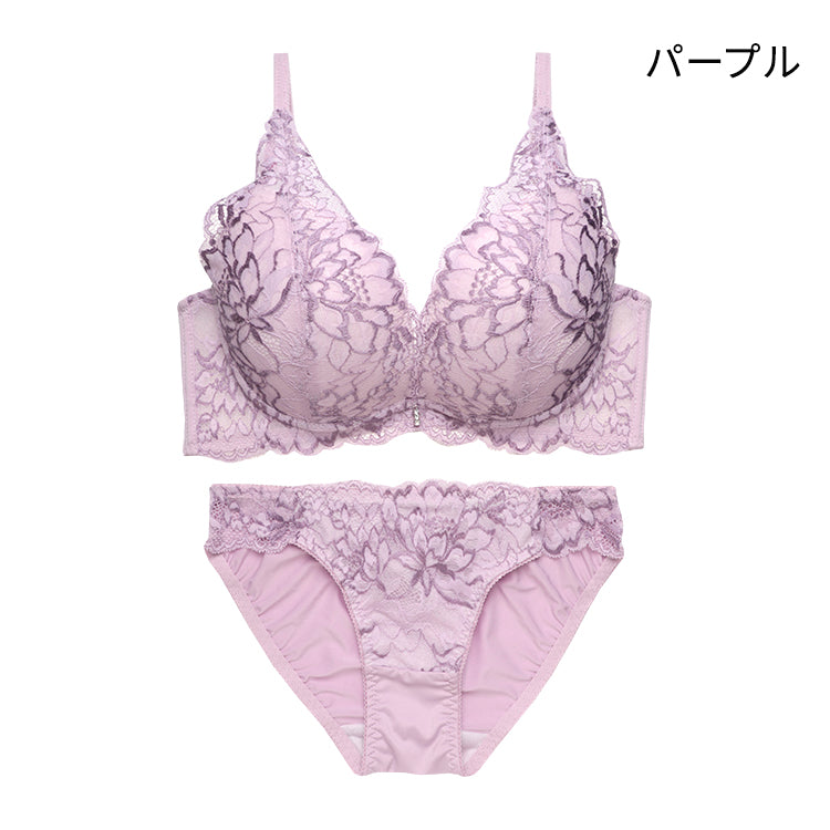 繊細な大柄レースと厚めパッドで、華やかな谷間をメイクするブラ&ショーツ