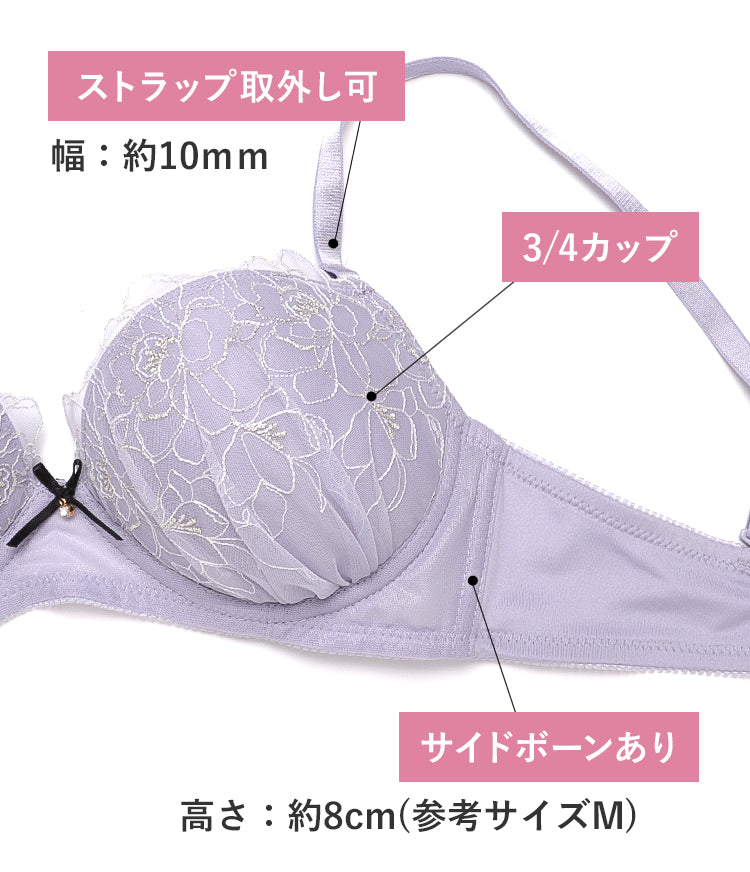 | 仕様 | [ブラ] カップ:3/4カップ ホック:2段3列 パッド:厚内蔵パッド(約10mm)・パッドポケットなし ストラップ:取り外し可・ストラップ幅:約10mm ワイヤー:なし サイドボーン:あり 脇の高さ:約8cm [フルバックショーツ] 透け感:ブラックなし/パープルややあり クロッチあて布付 伸縮性:タテ○ ヨコ○(バックのみ) |