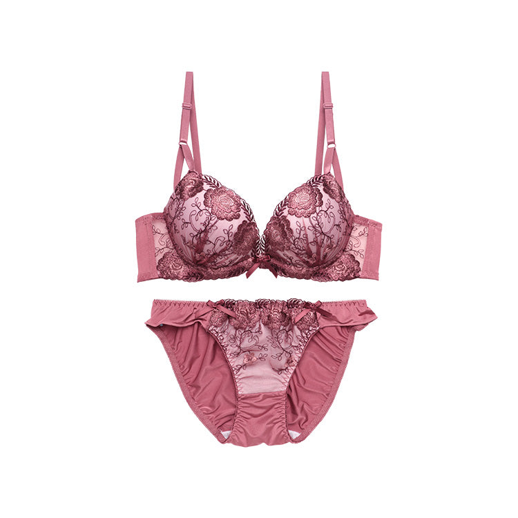 深みのあるカラーに鮮やかな刺繍が映える、大人の色香漂う脇高ブラ&ショーツ