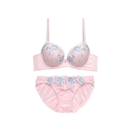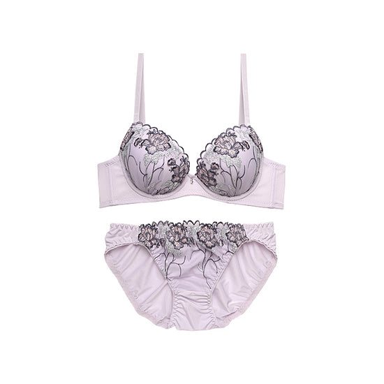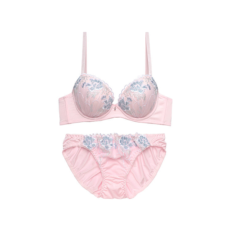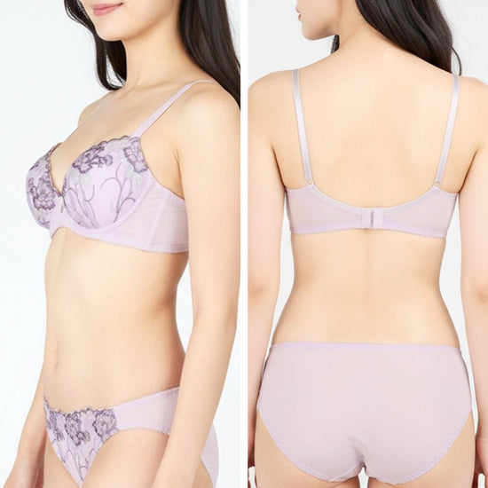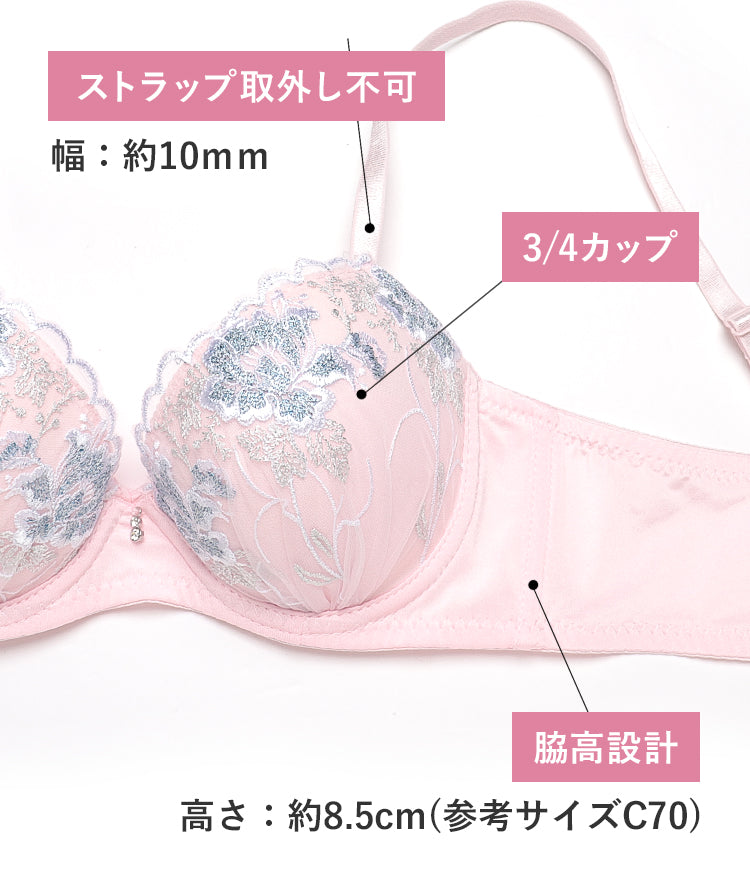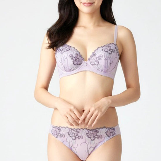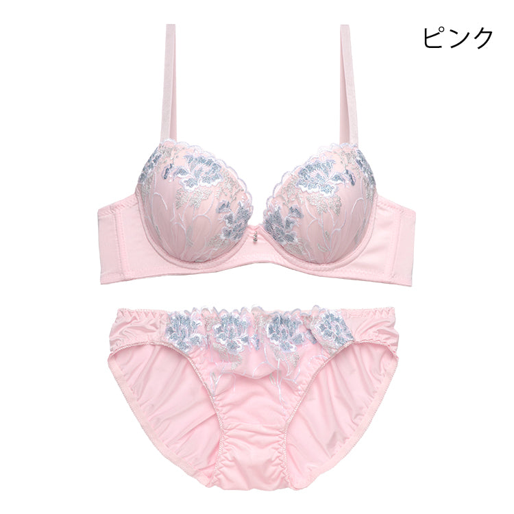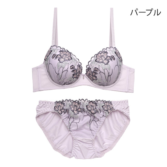 洗練された輝きを放つ花柄刺繍と脇高設計で、上品かつ機能的な美バストを叶えるブラ&ショーツセット