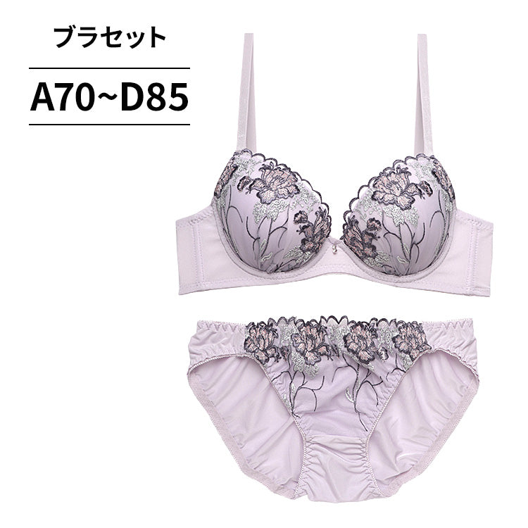 洗練された輝きを放つ花柄刺繍と脇高設計で、上品かつ機能的な美バストを叶えるブラ&ショーツセット