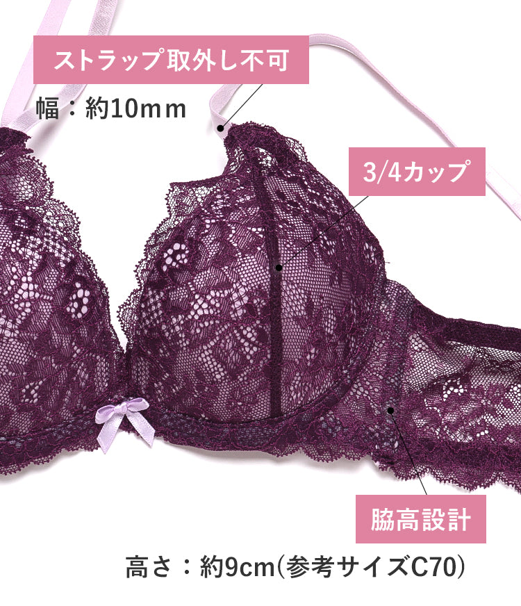 | 仕様 | [ブラ] カップ:3/4カップ ホック:2段3列 パッド:厚内蔵パッド(約12mm)・パッドなし(ポケットなし) ストラップ:取り外し不可・幅約10mm ワイヤー:ミディアムワイヤー入り(L字) サイドボーン:あり 脇の高さ:約9cm [フルバックショーツ] 透け感:ややあり クロッチ当て布:あり 伸縮性:タテ○ ヨコ○(バックのみ) |