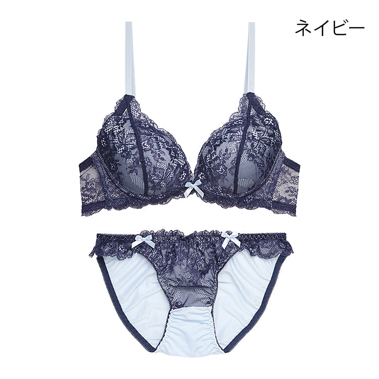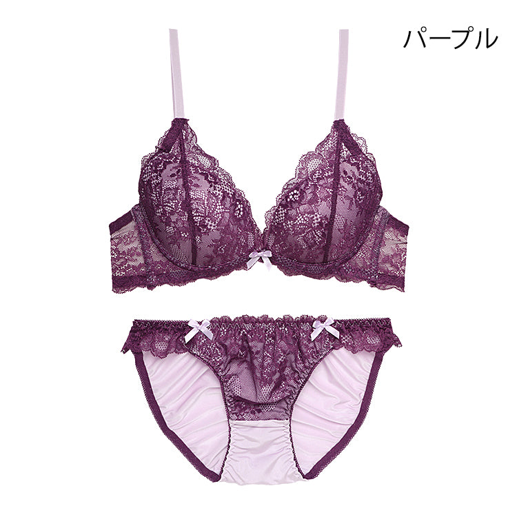 洗練された花柄刺繍と繊細なレースが調和し、脇高設計で美しいシルエットを叶えるブラ&ショーツ
