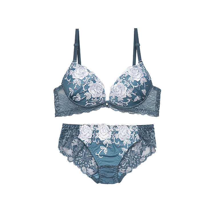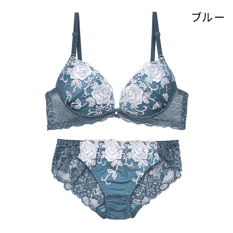 大輪の花柄レースと厚めの内蔵パッドで、華やかでボリュームのある胸元を演出するブラ&ショーツ