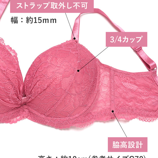 - 3/4カップ – 斜め下からバストを寄せ上げ、美しいバストラインをキープする定番シルエットです。