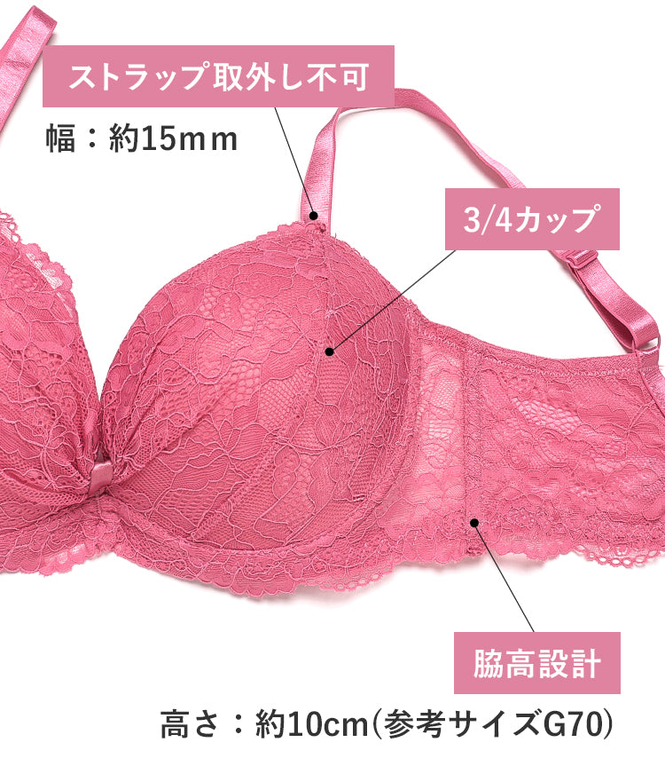 | 仕様 | [ブラ] カップ:3/4カップ ホック:3段3列 パッド:厚内蔵パッド(約13mm)・パッドなし(ポケットなし) ストラップ:取り外し不可・幅約15mm ワイヤー:ミディアムワイヤー入り(L字) サイドボーン:あり 脇の高さ:約15cm [フルバックショーツ] 透け感:あり(バックレース) クロッチ当て布:あり 伸縮性:タテ○ ヨコ○(バックのみ) |
