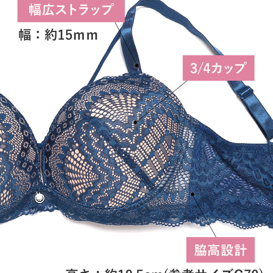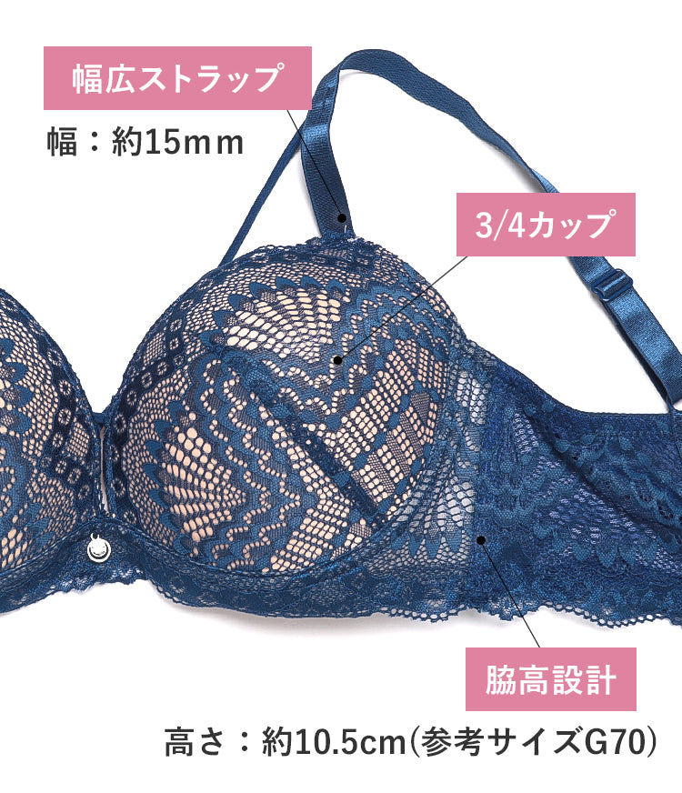 - 3/4カップ – バストを斜め下から中央へ寄せ上げ、理想的なバストラインをキープします。