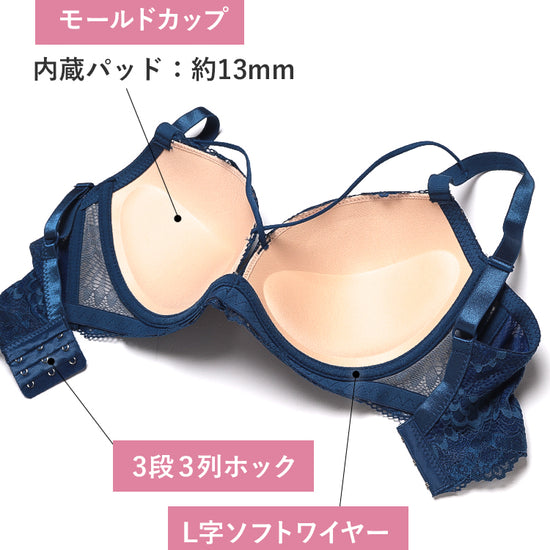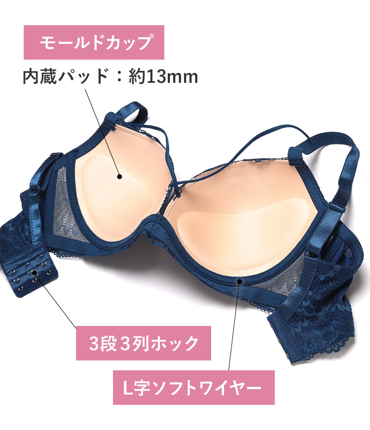 - 厚手の中蔵パッド(約13mm) – カップ下部に厚みを持たせた約13mmの内蔵パッドが、バストを力強く押し上げます。