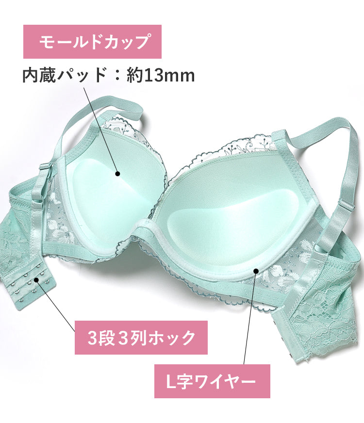 - 理想の谷間を作るL字ワイヤー – 前中心が低めのL字型ワイヤーを採用。痛くなりにくく、バストを中央へ寄せて深い谷間を長時間キープします。