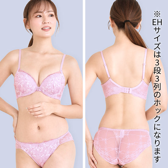 | 仕様 | [ブラ] カップ:3/4カップ ホック:3段3列 パッド:厚内蔵パッド(約13mm)・パッドなし(ポケットなし) ストラップ:取り外し不可・幅約15mm ワイヤー:ミディアムワイヤー入り(L字) サイドボーン:あり 脇の高さ:約10cm [フルバックショーツ] 透け感:あり(バックレース) クロッチ当て布:あり 伸縮性:タテ○ ヨコ○(バックのみ) |