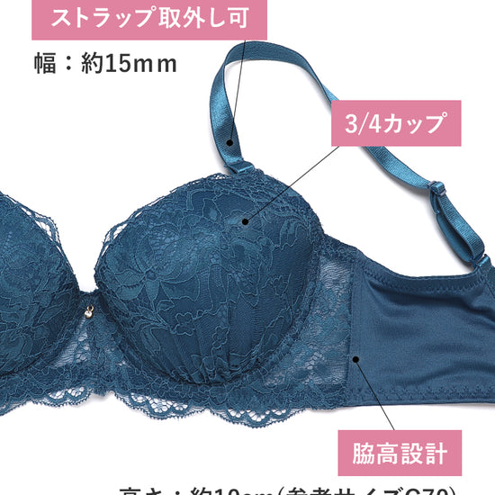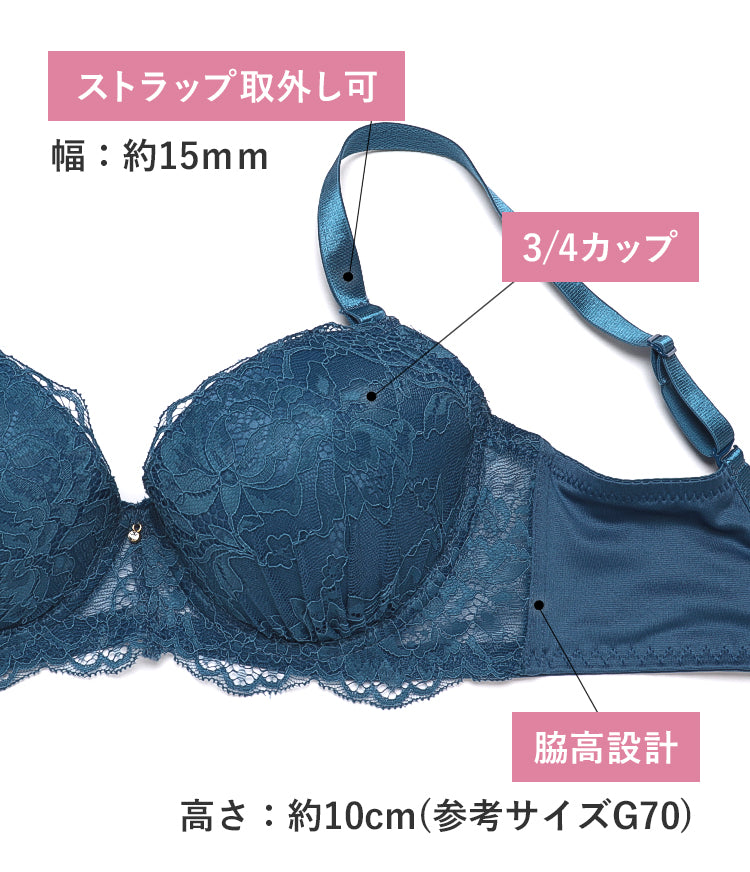 - 3/4カップ – バストを斜め下から中央へ寄せ、美しい谷間とボリュームを作ります。