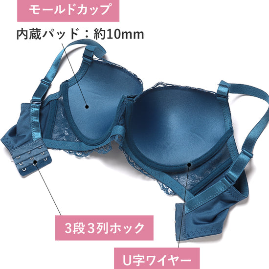 | 仕様 | [ブラ] カップ:3/4カップ ホック:3段3列 パッド:厚内蔵パッド(約10mm)・パッドなし(ポケットなし) ストラップ:取り外し可・幅約15mm ワイヤー:ミディアムワイヤー入り(U字) サイドボーン:あり 脇の高さ:約10cm [フルバックショーツ] 透け感:なし クロッチ当て布:あり 伸縮性:タテ○ ヨコ○(バックのみ) |