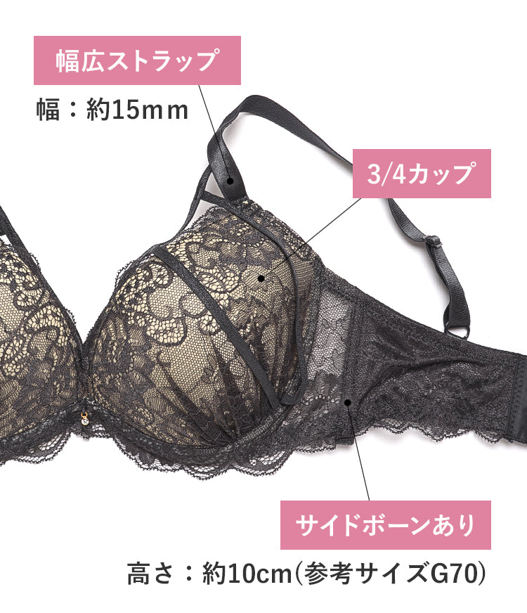 - 3/4カップ – 斜め下からバストを寄せ上げ、美しいデコルテラインをキープする定番シルエットです。