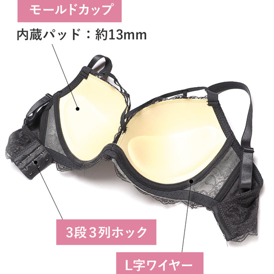 - ボリュームを支える厚手パッド – カップ内部には約13mmの内蔵パッドを搭載。バストを下から押し上げ、ふっくらとした上胸のボリュームを演出します。