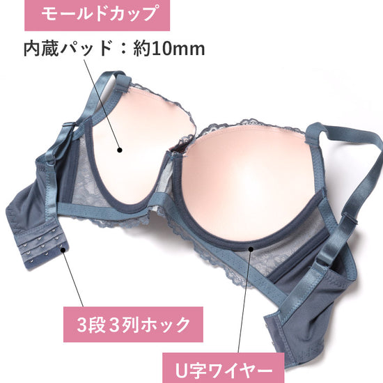 - バストを支えるU字ワイヤー – バストを土台からしっかり包み込み、重みのあるバストを高い位置で安定してキープします。