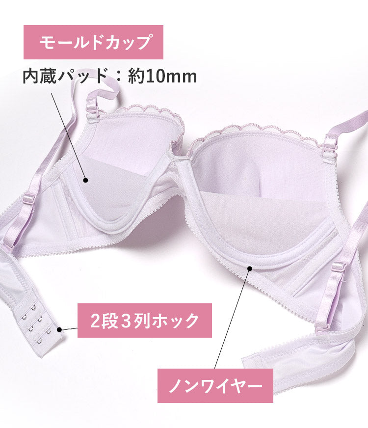 | 仕様 | [ブラ] カップ:3/4カップ ホック:2段3列 パッド:厚内蔵パッド(約10mm)・パッドポケットなし ストラップ:取り外し可・ストラップ幅:約10mm ワイヤー:なし サイドボーン:あり 脇の高さ:約8cm [フルバックショーツ] 透け感:ややあり クロッチあて布付 伸縮性:タテ○ ヨコ○(バックのみ) |